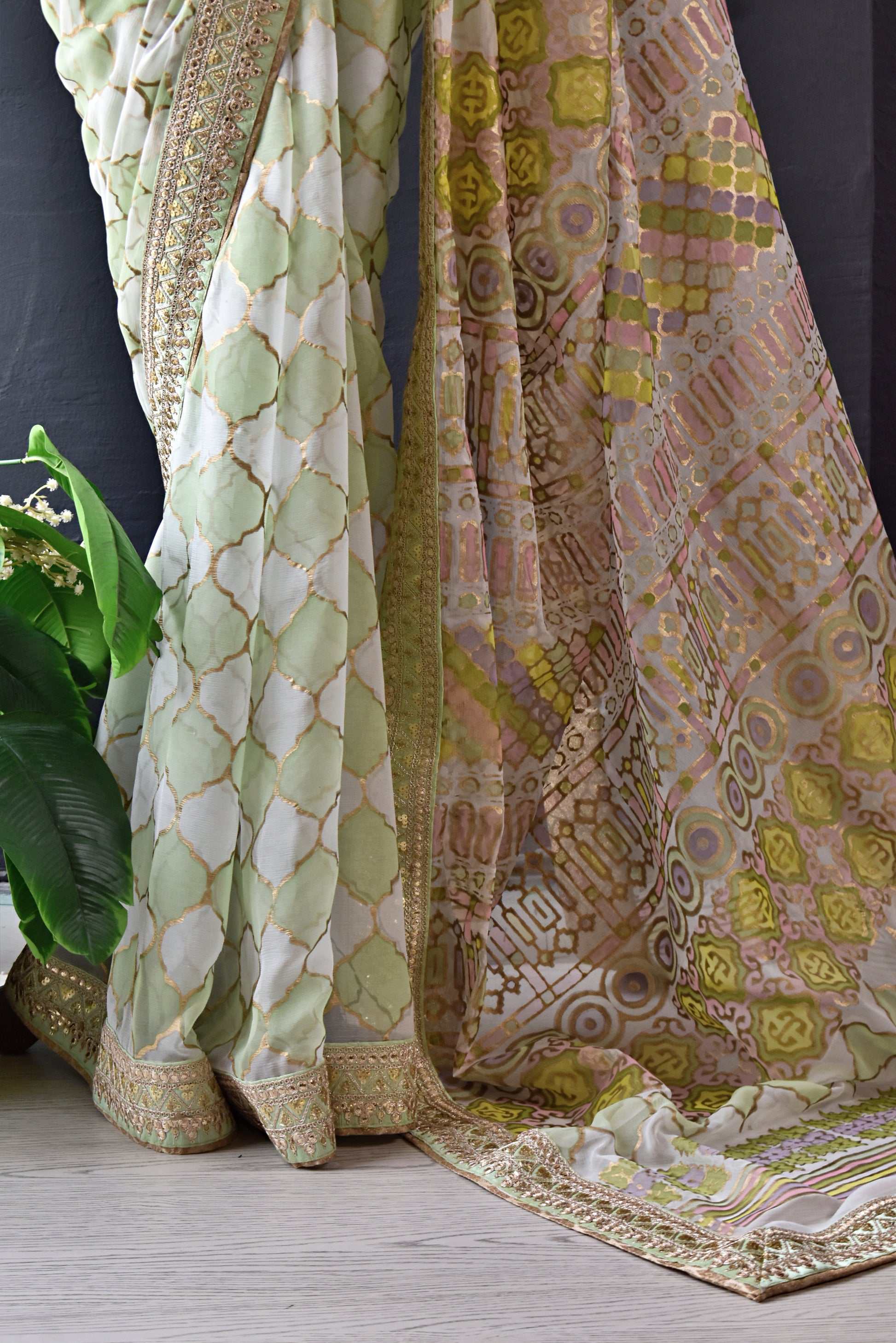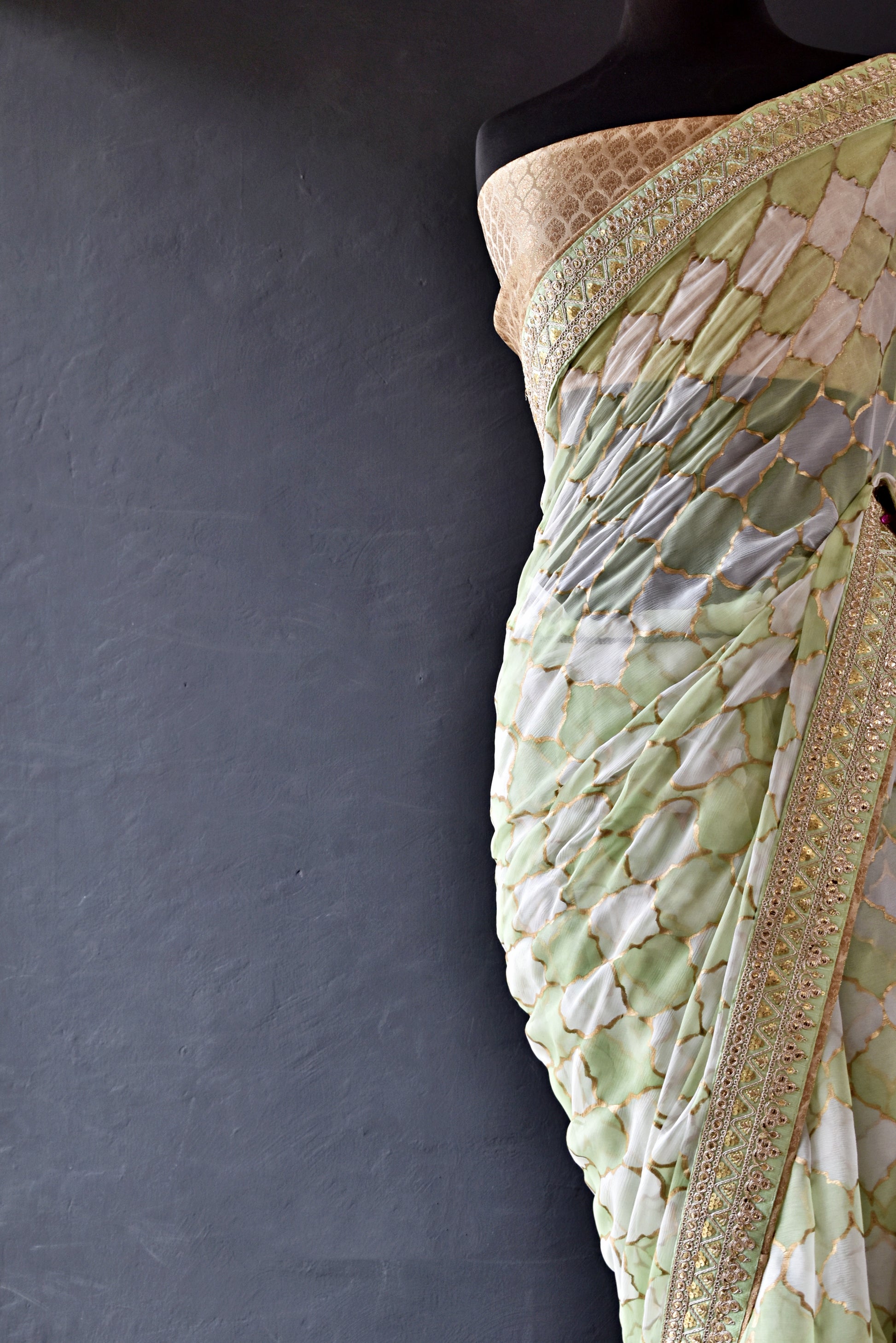 Framing gorgeous hand‑painted designs is an exquisite gold block‑print border that adds a regal, textured shimmer, making the painted patterns pop like jewels on the fabric. Sari comes with gold banarsi blouse and finishing. Sari has pista and gold embroidered border.