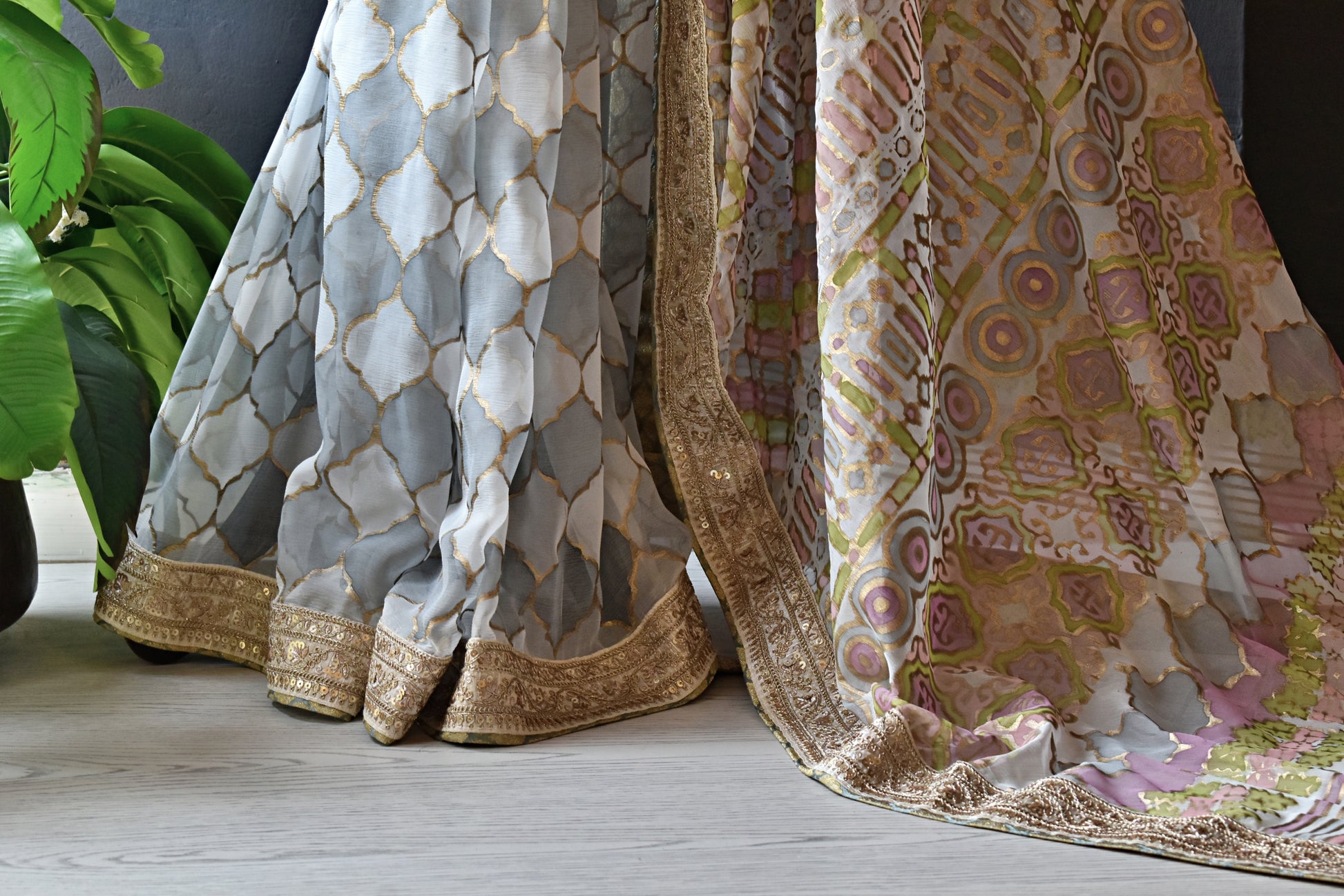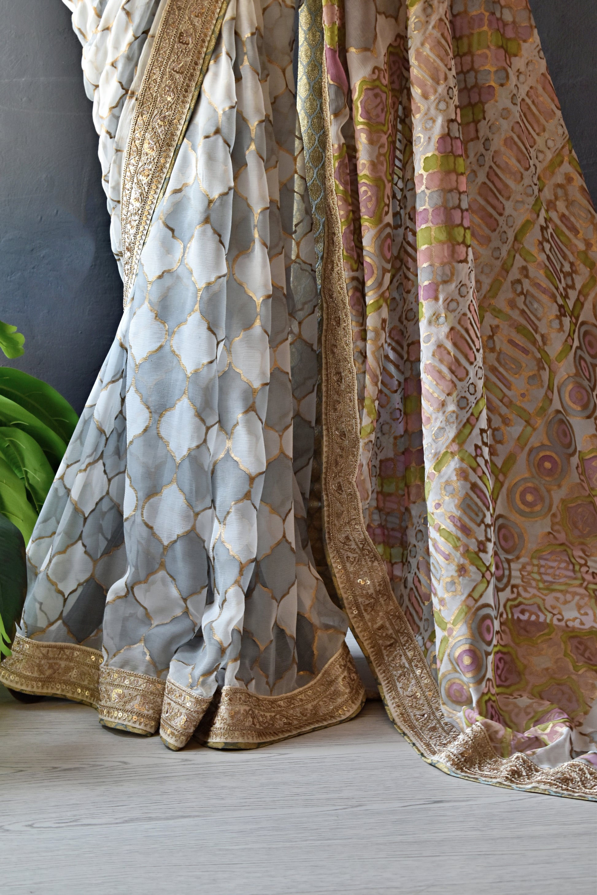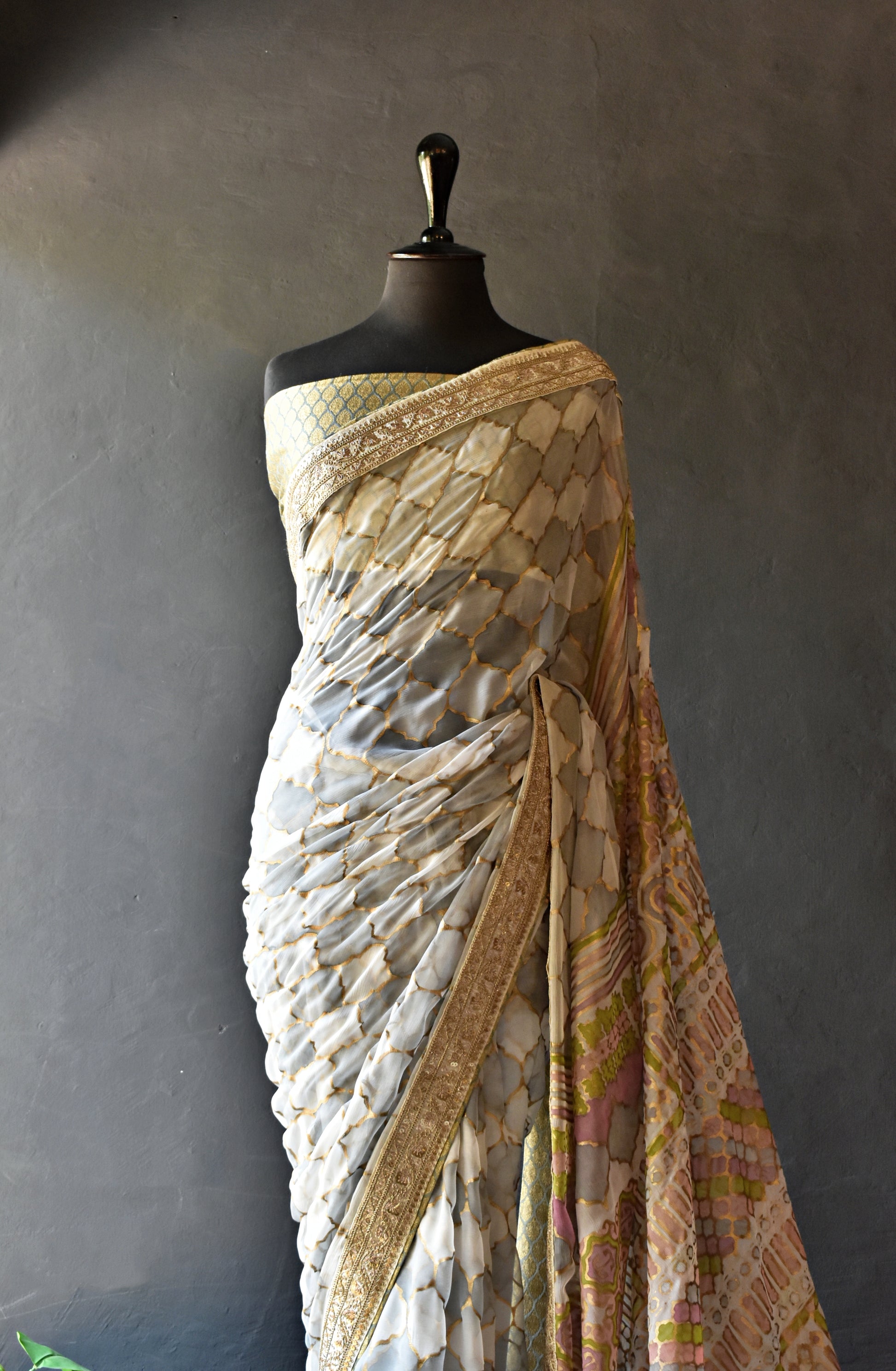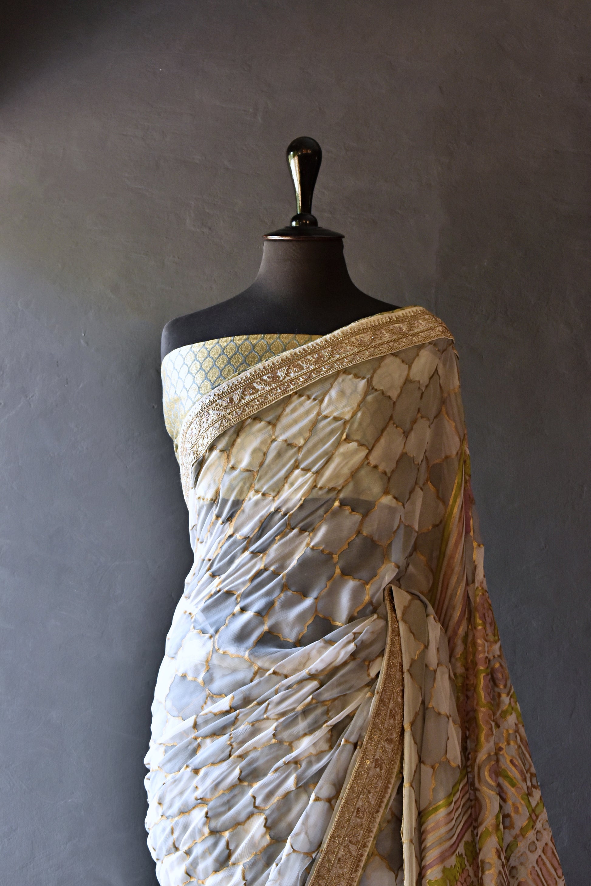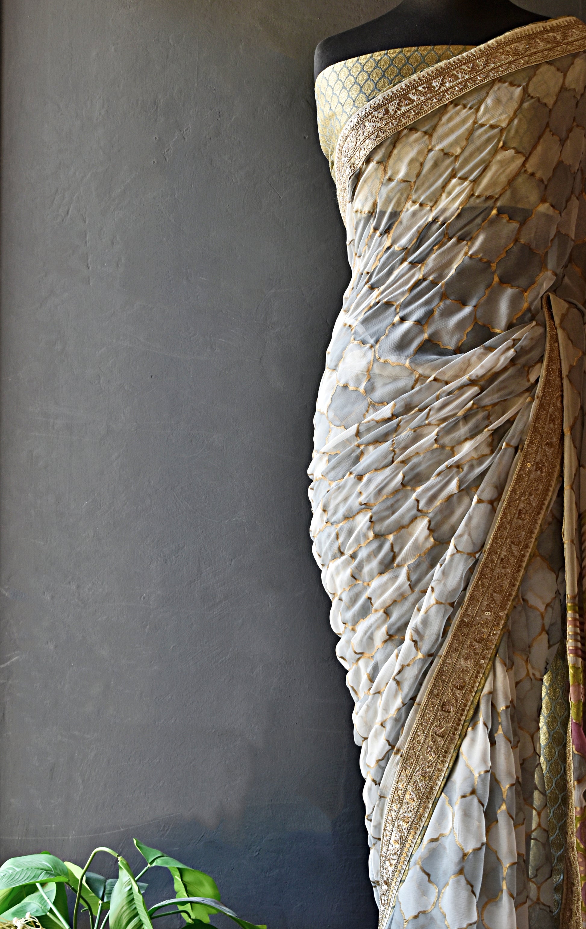 The grey base is transformed by delicate hand-painted motifs and subtle geometric patterns that evoke the mystery of a moonlit night. Pure chiffon grey Fully hand hand painted with gold block print around painted patterns Sari comes with gold and grey banarsi blouse and finishing. Sari has gold embroidered border.