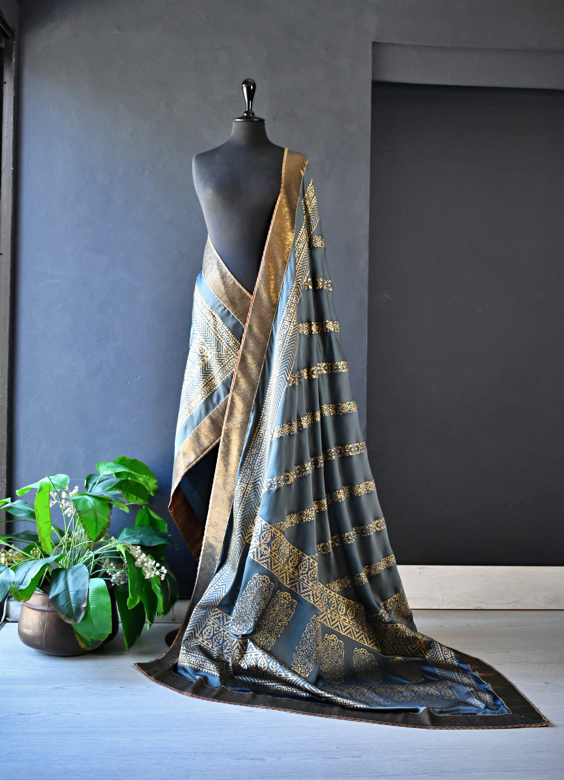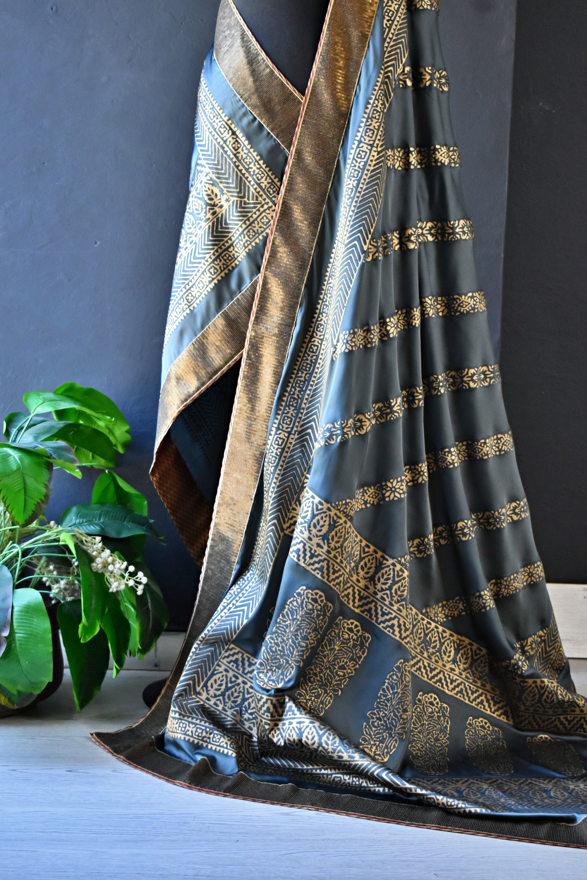 Experience the beauty of simplicity with our elegant grey silk shawl featuring delicate golden block prints. This sophisticated piece is perfect for adding a touch of refinement to any outfit. It has sequins border and banarsi finishing.