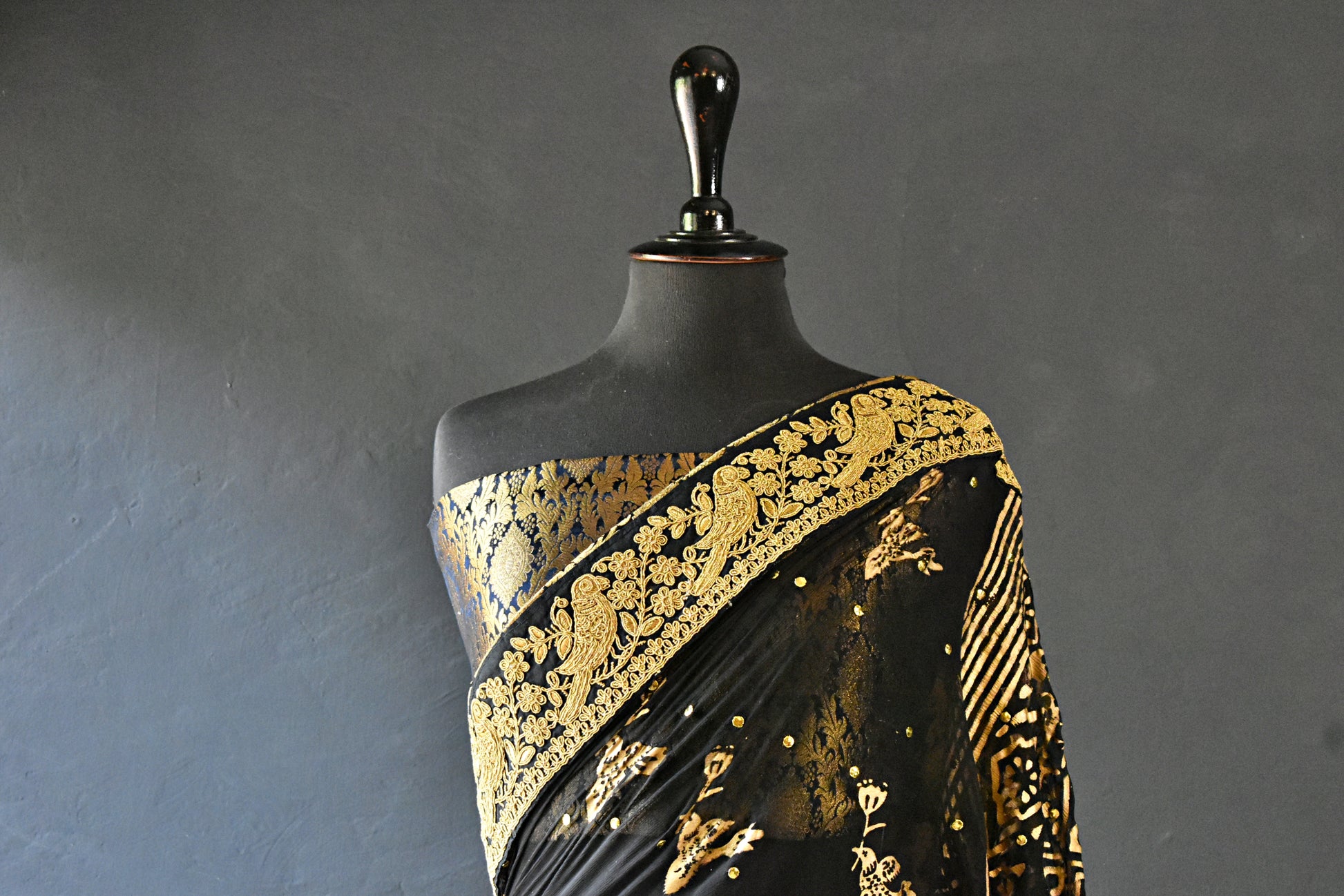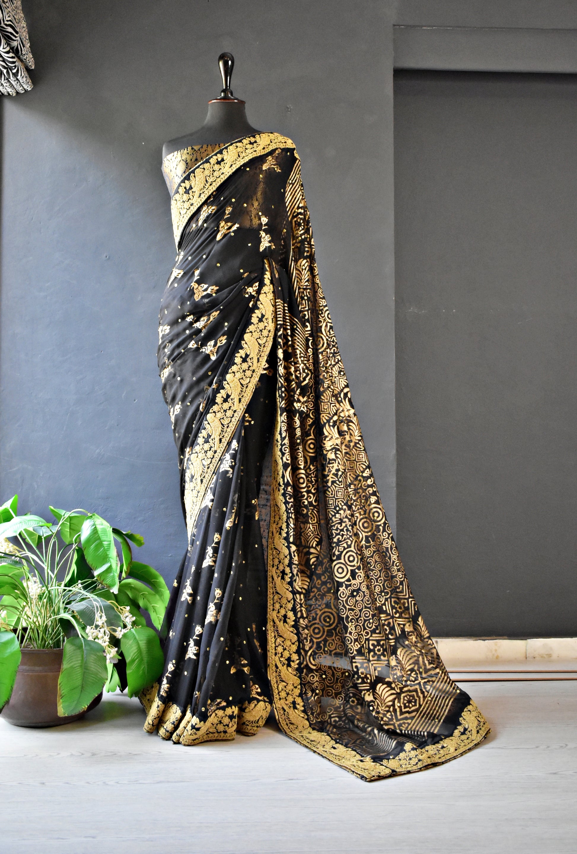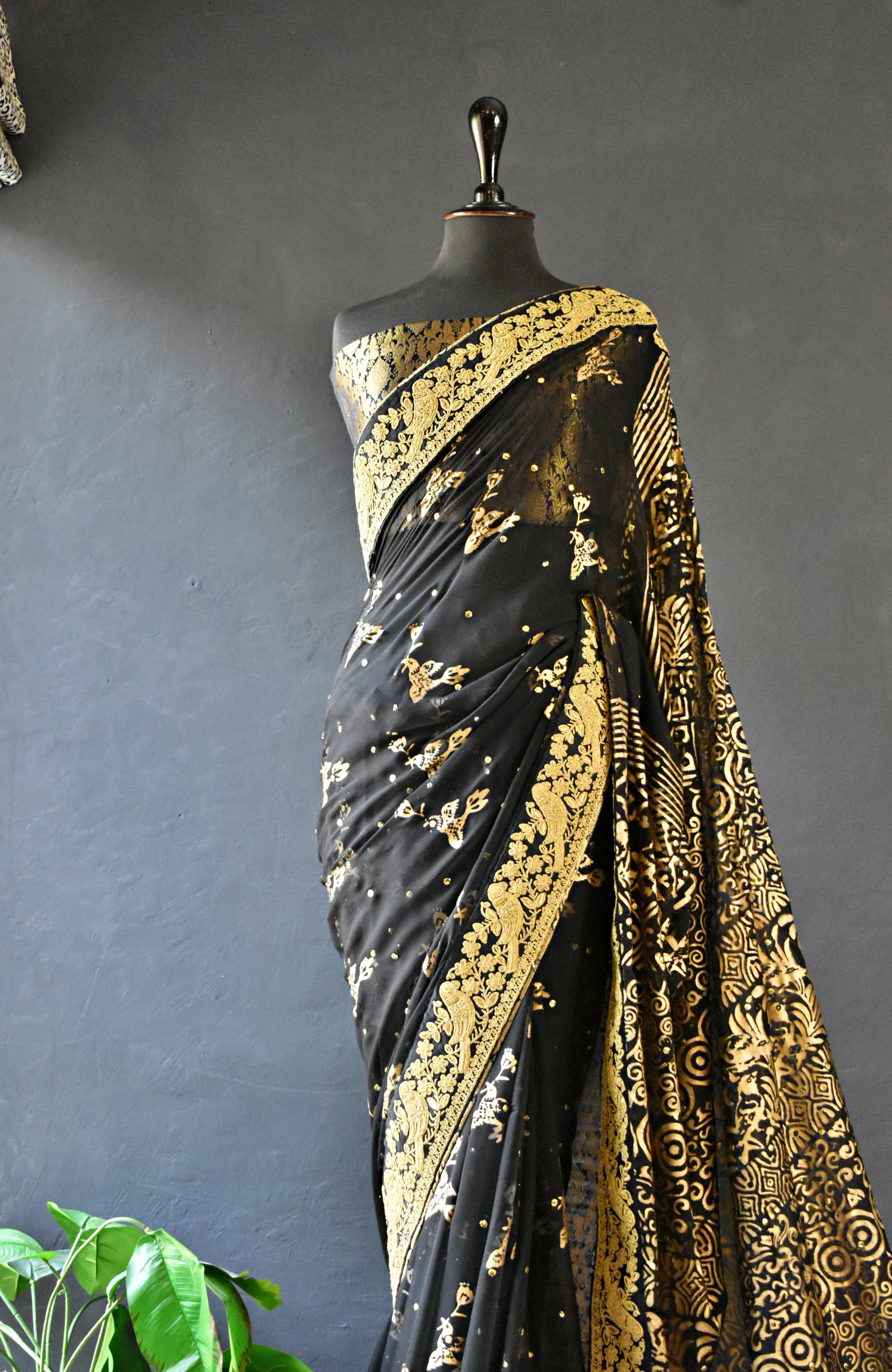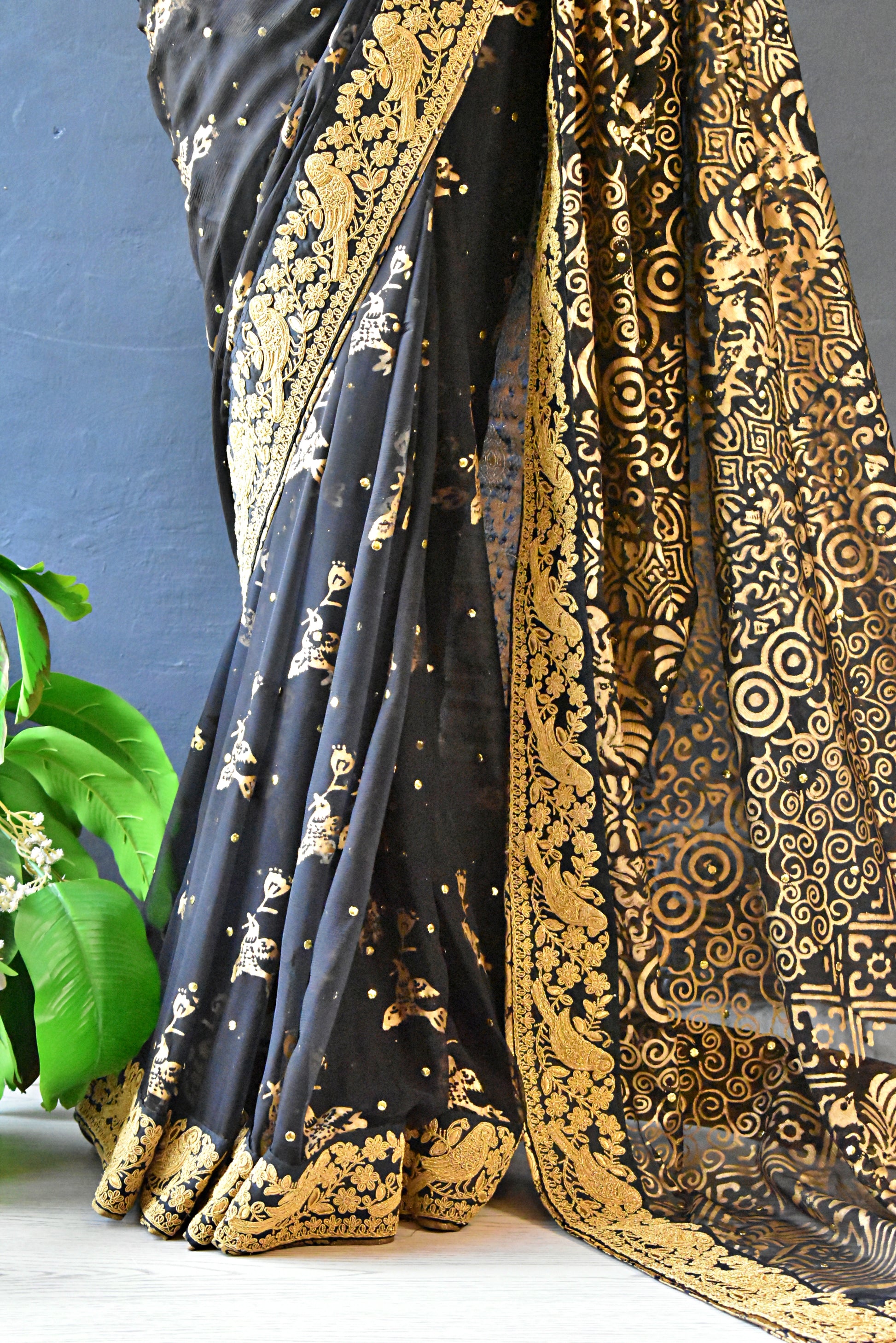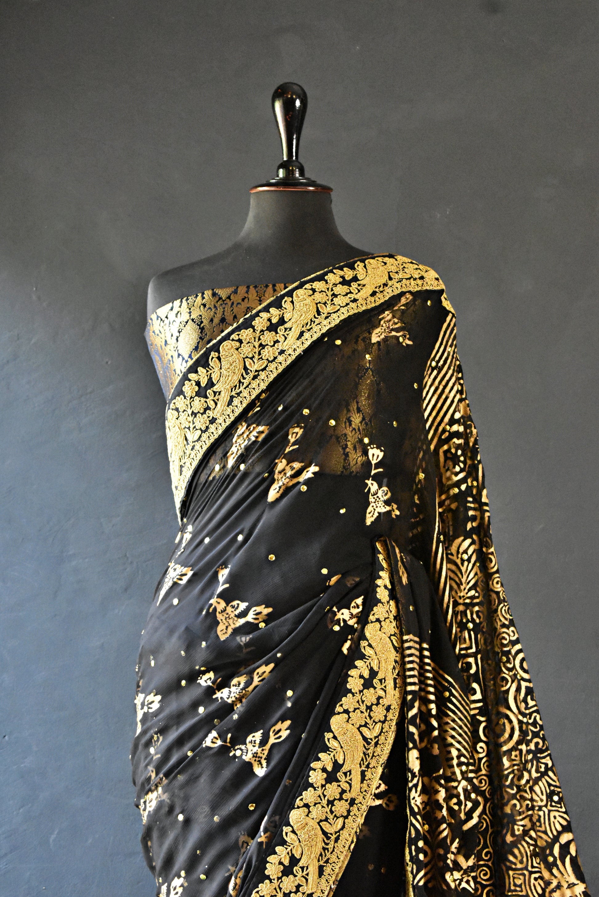 Channel your inner dark goddess with our breathtaking black chiffon block-printed sari, featuring mukesh work that shines like diamonds in the night. Sari comes with black and gold banarsi blouse and finishing. Sari has gold lace border with printed birdies.