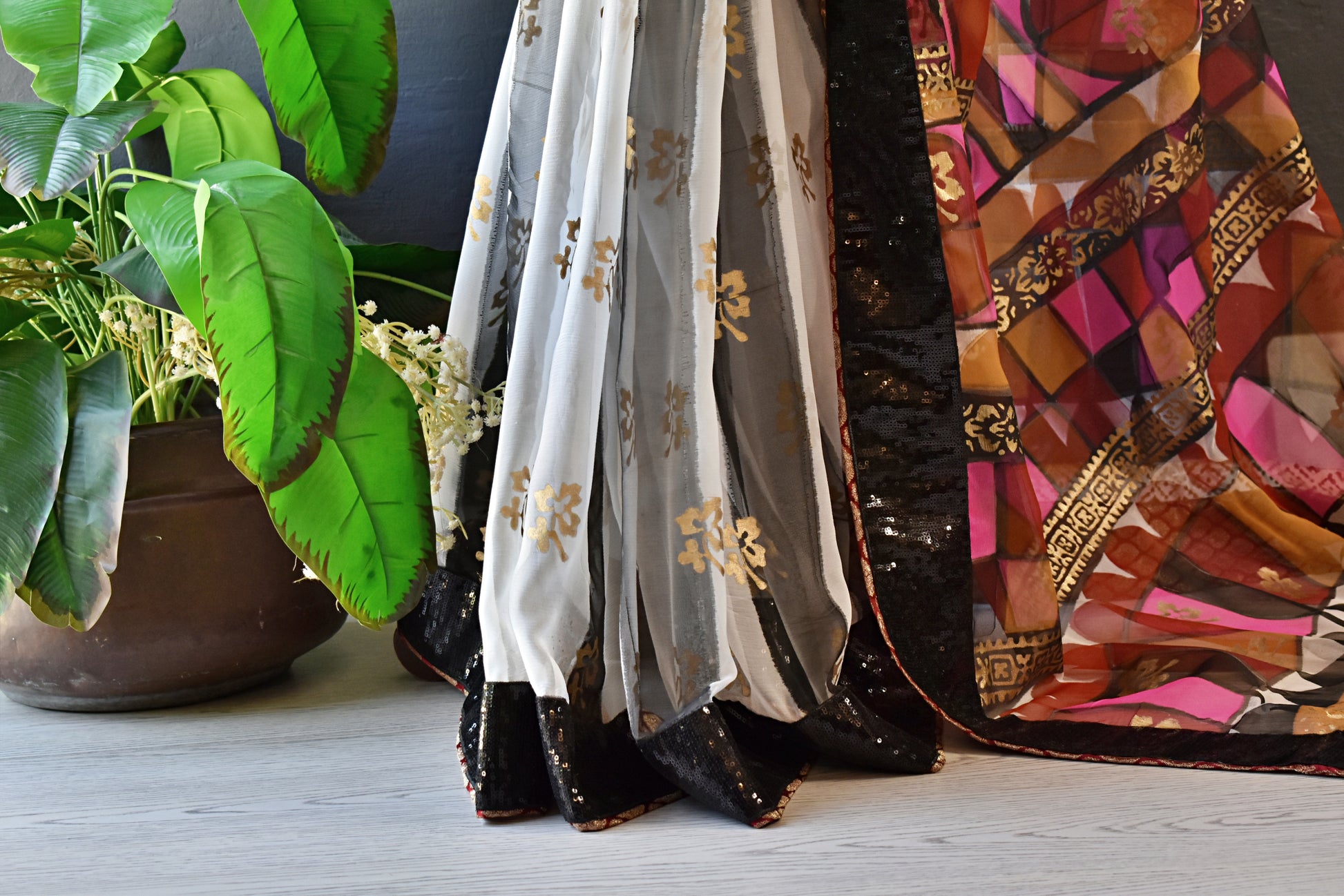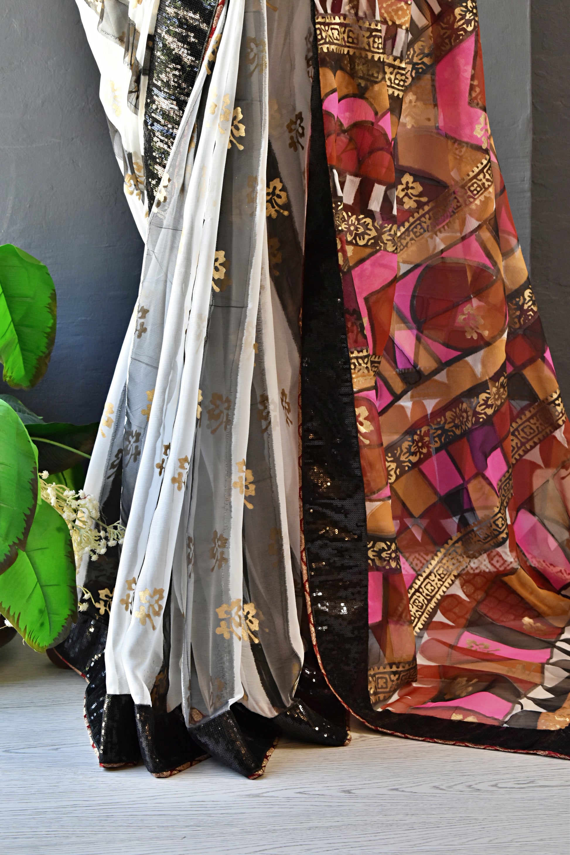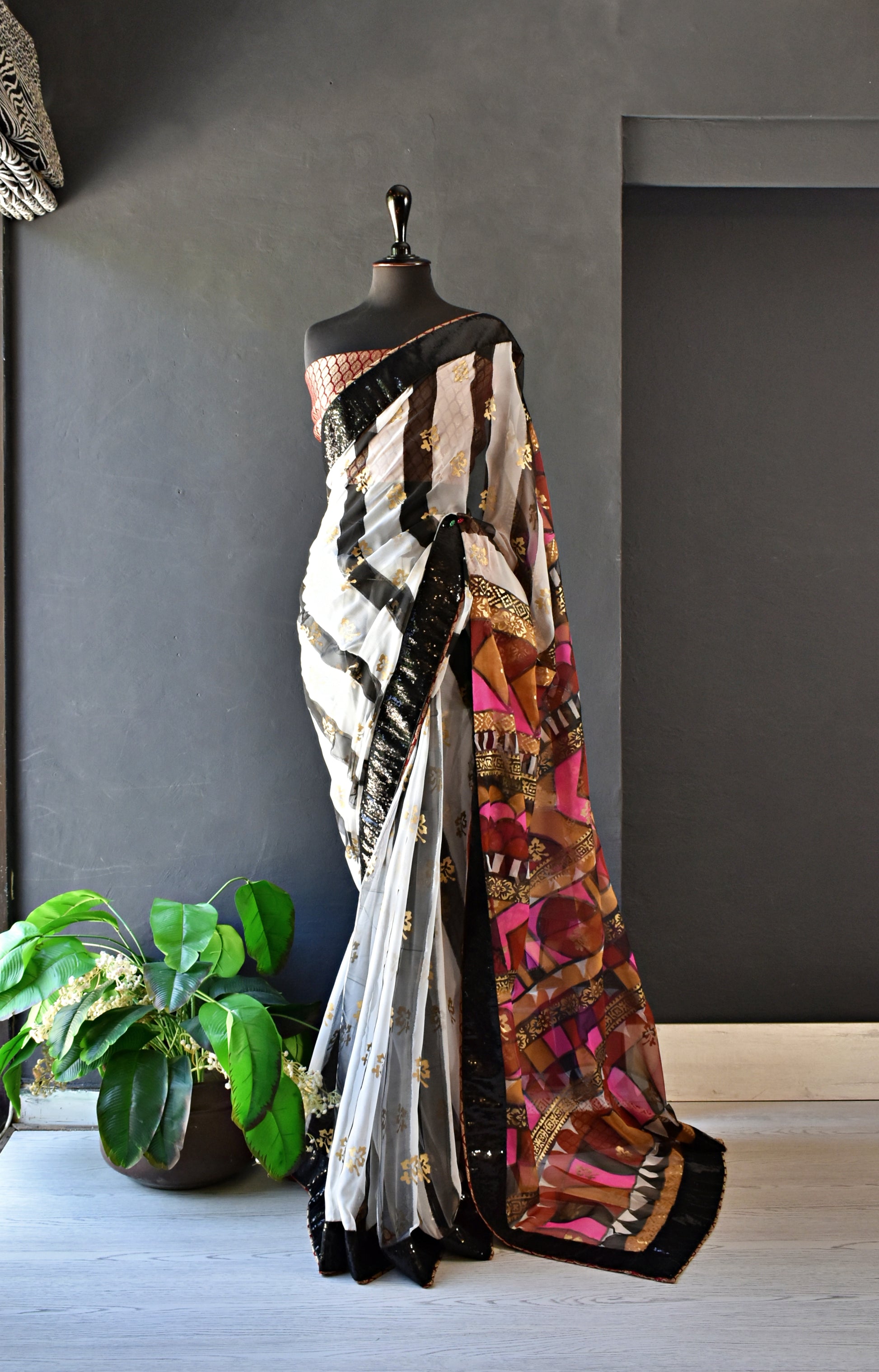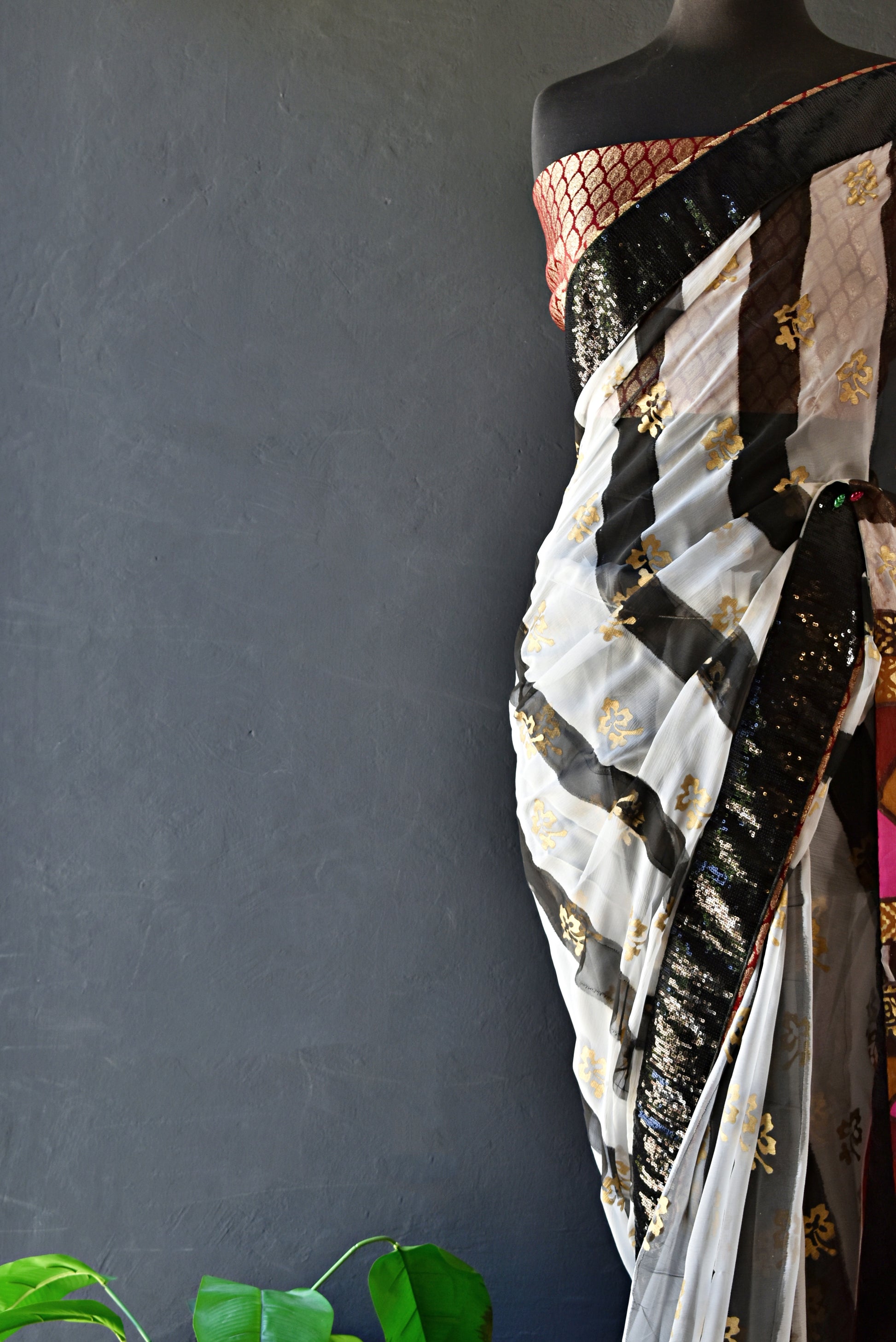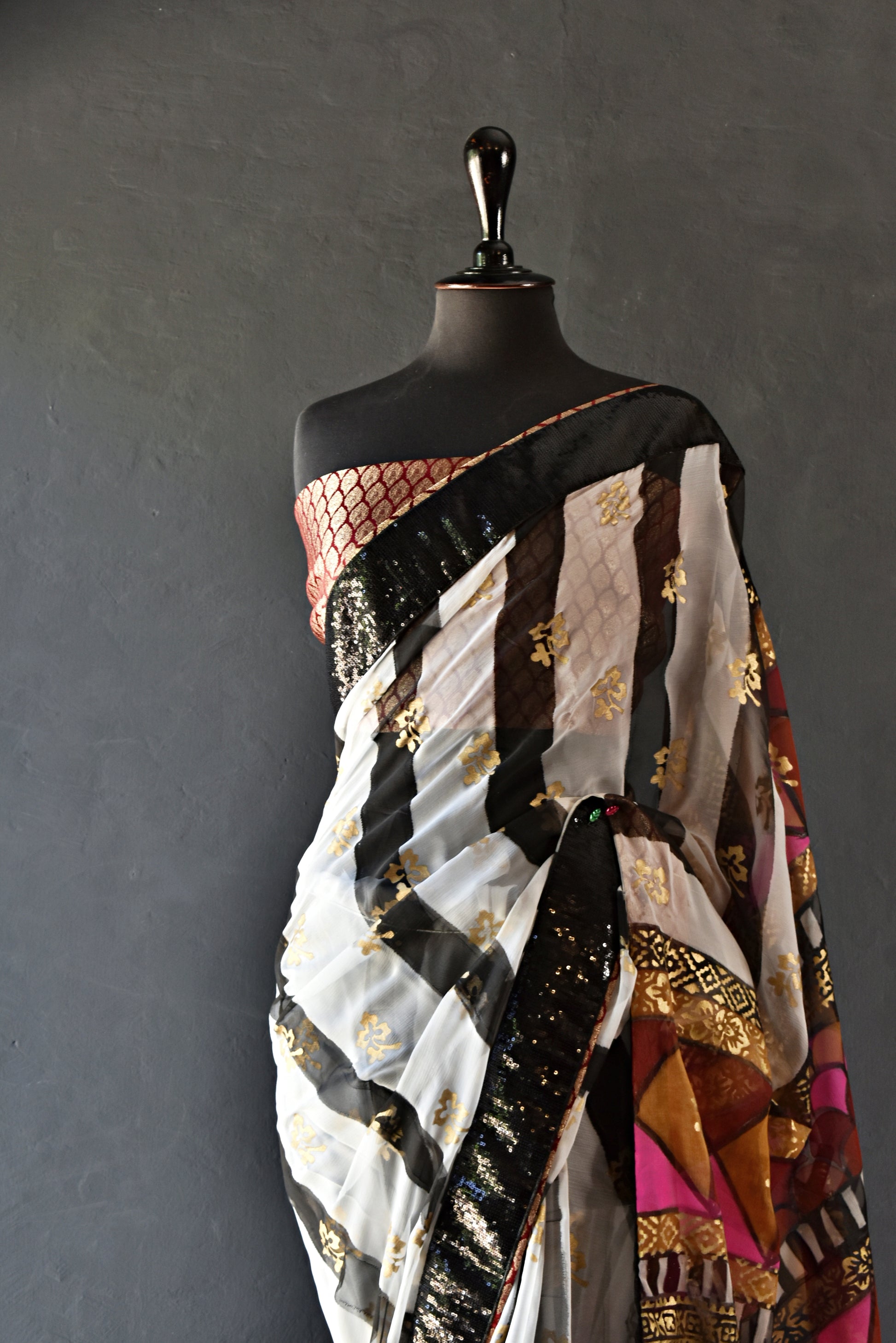 Like a night sky striped with moonbeams, this sari captivates with its bold contrast and artisanal finesse. Black and white striped fully hand painted and block printed chiffon sari comes with maroon and gold banarsi blouse and finishing. Sari has black sequins border.