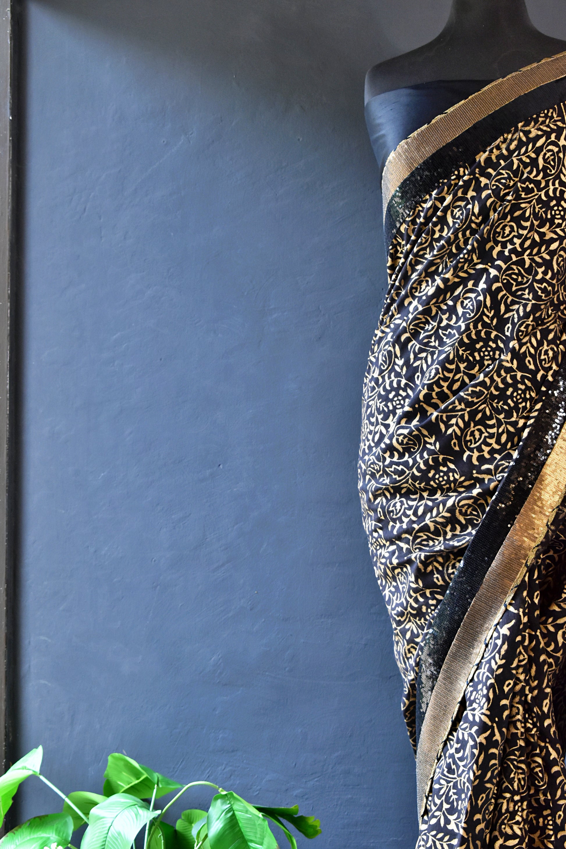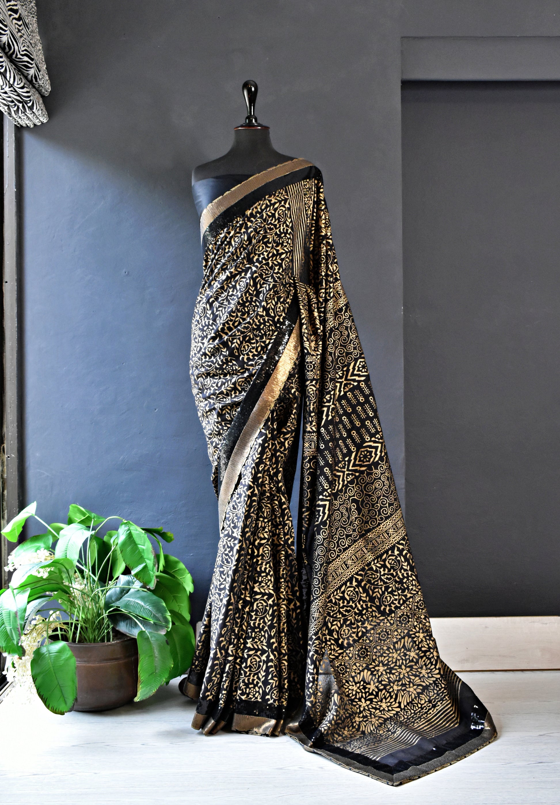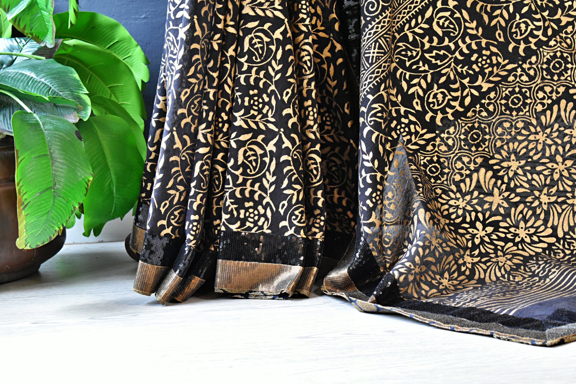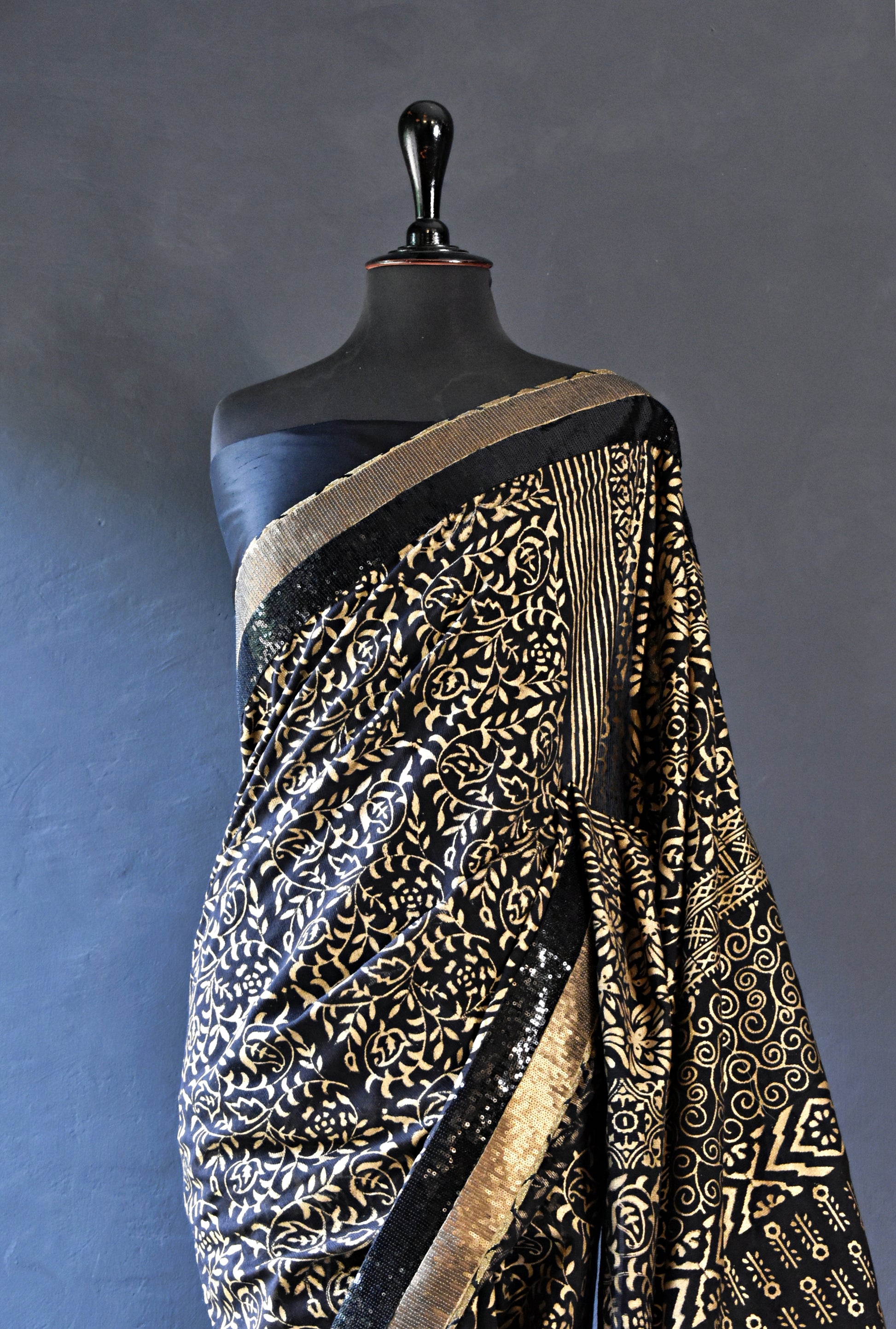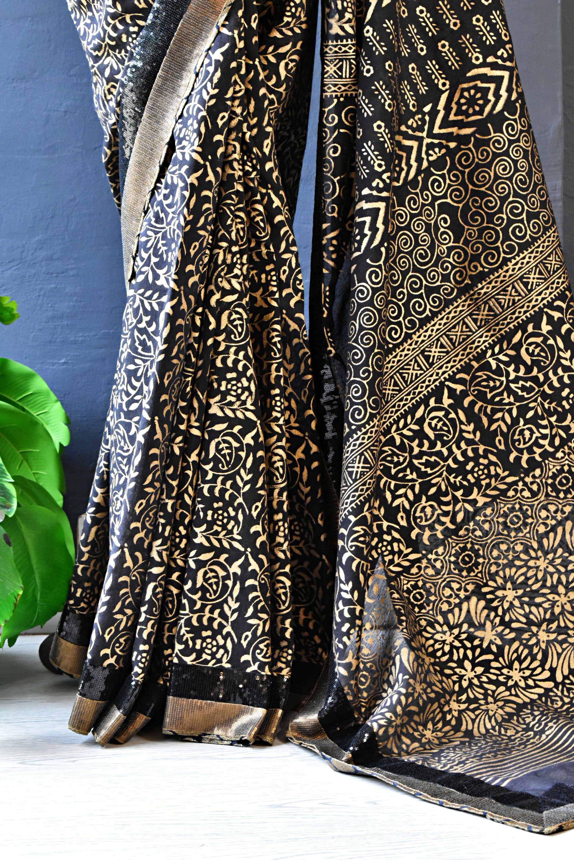 Get ready to dazzle with this black organza karandi sari, where every fold tells a story of luxury and refinement! Sari with gold block print comes with plain silk black blouse and gold and black banarsi finishing. Sari has double gold and black sequins lace border.