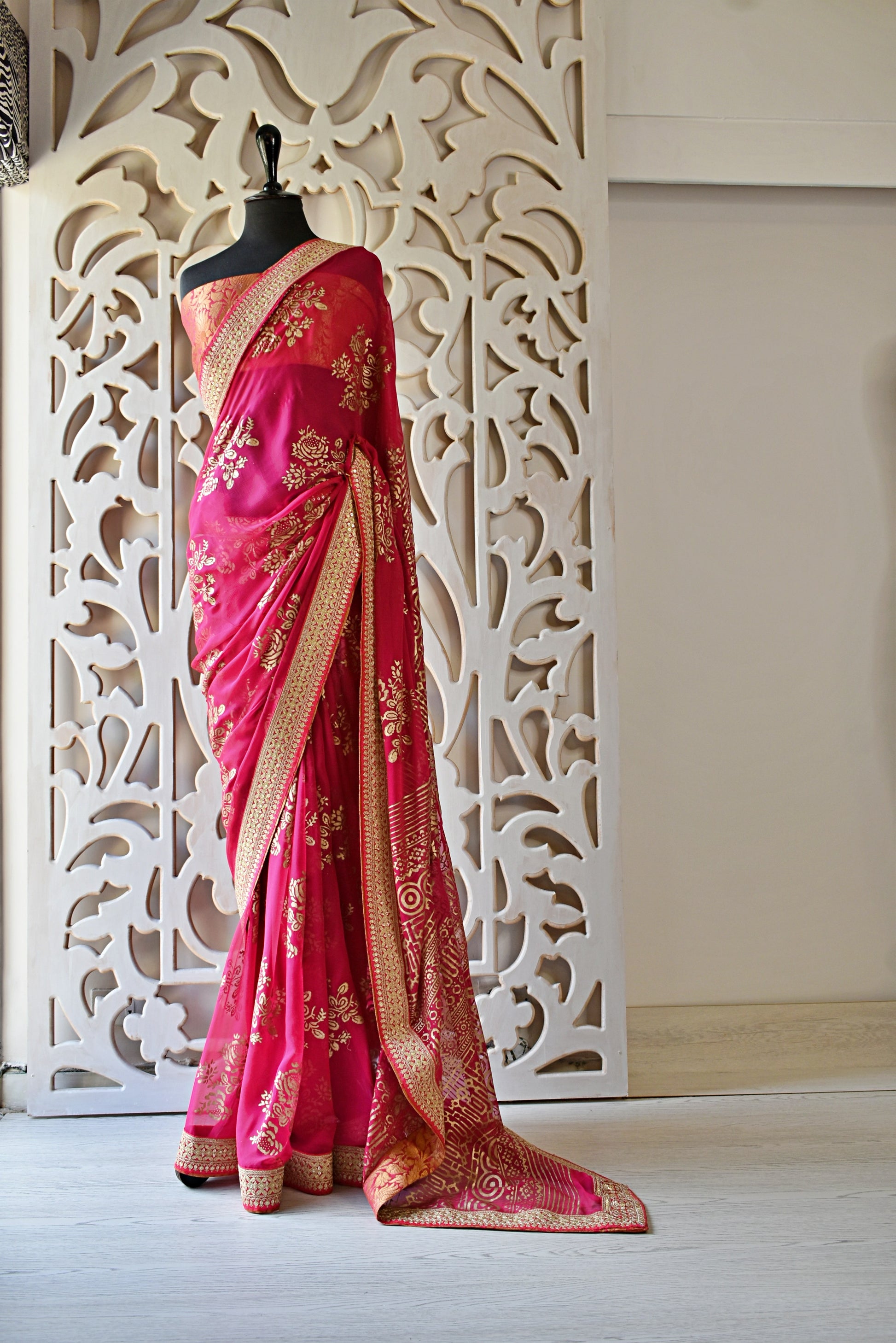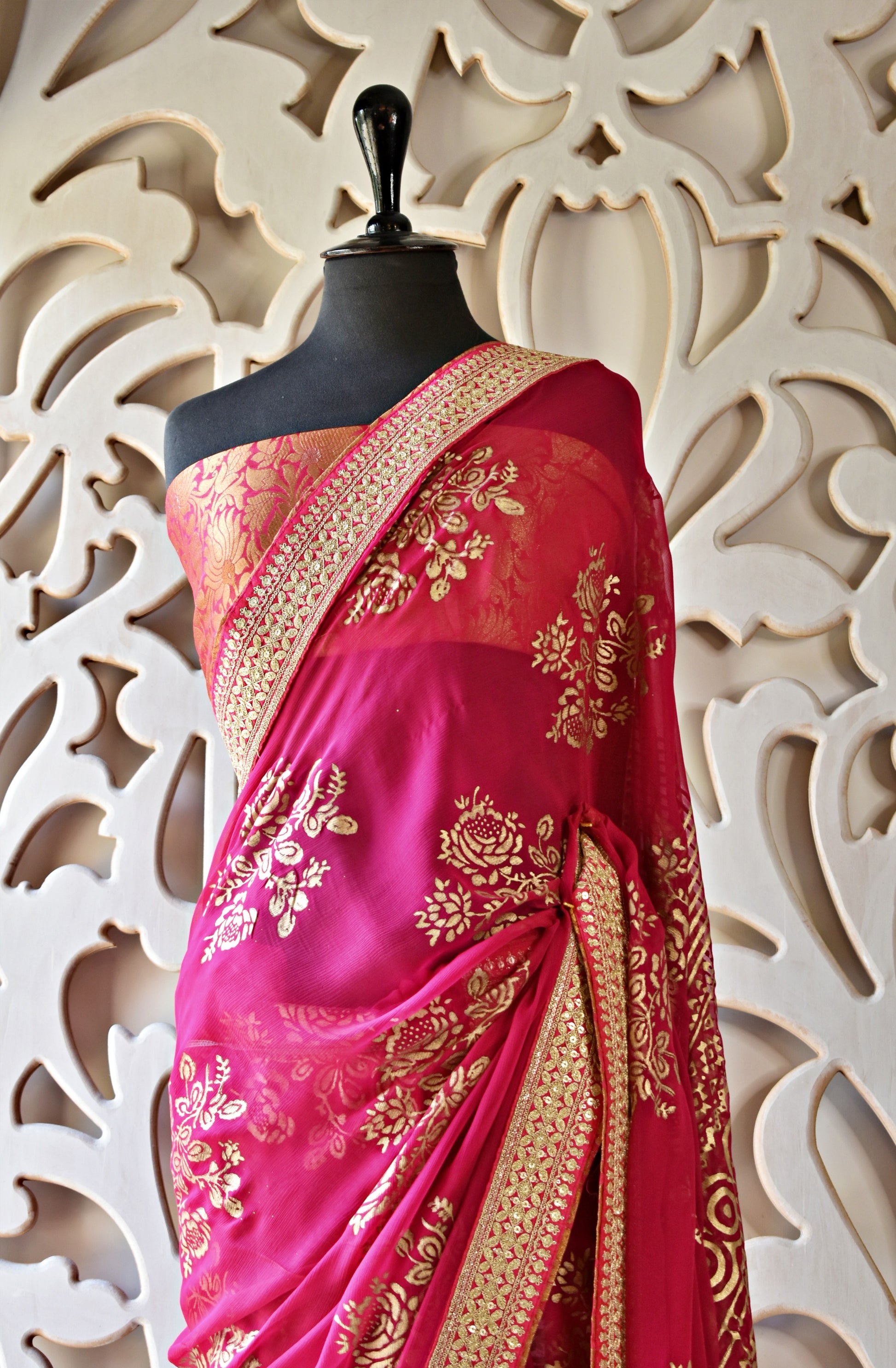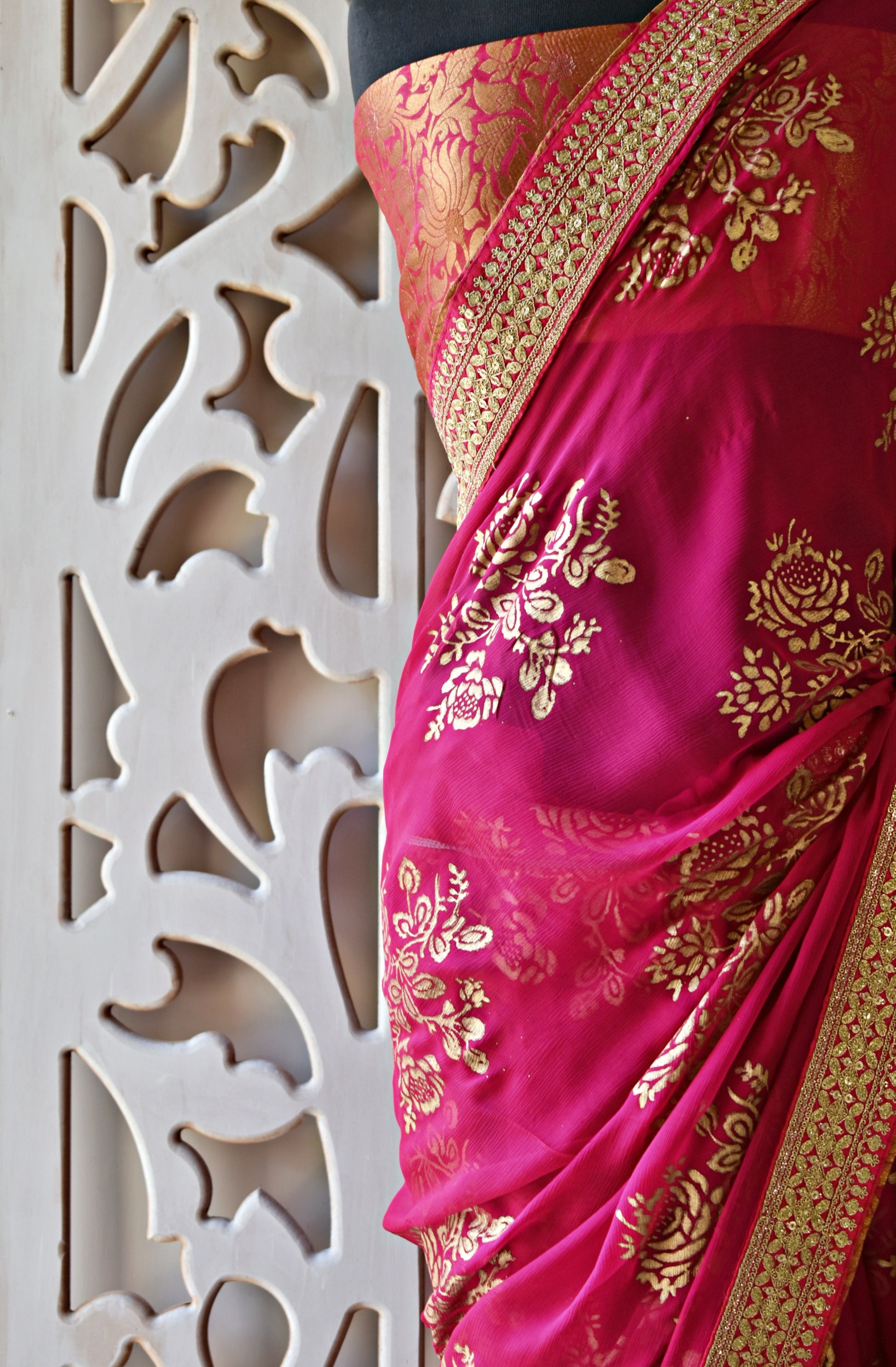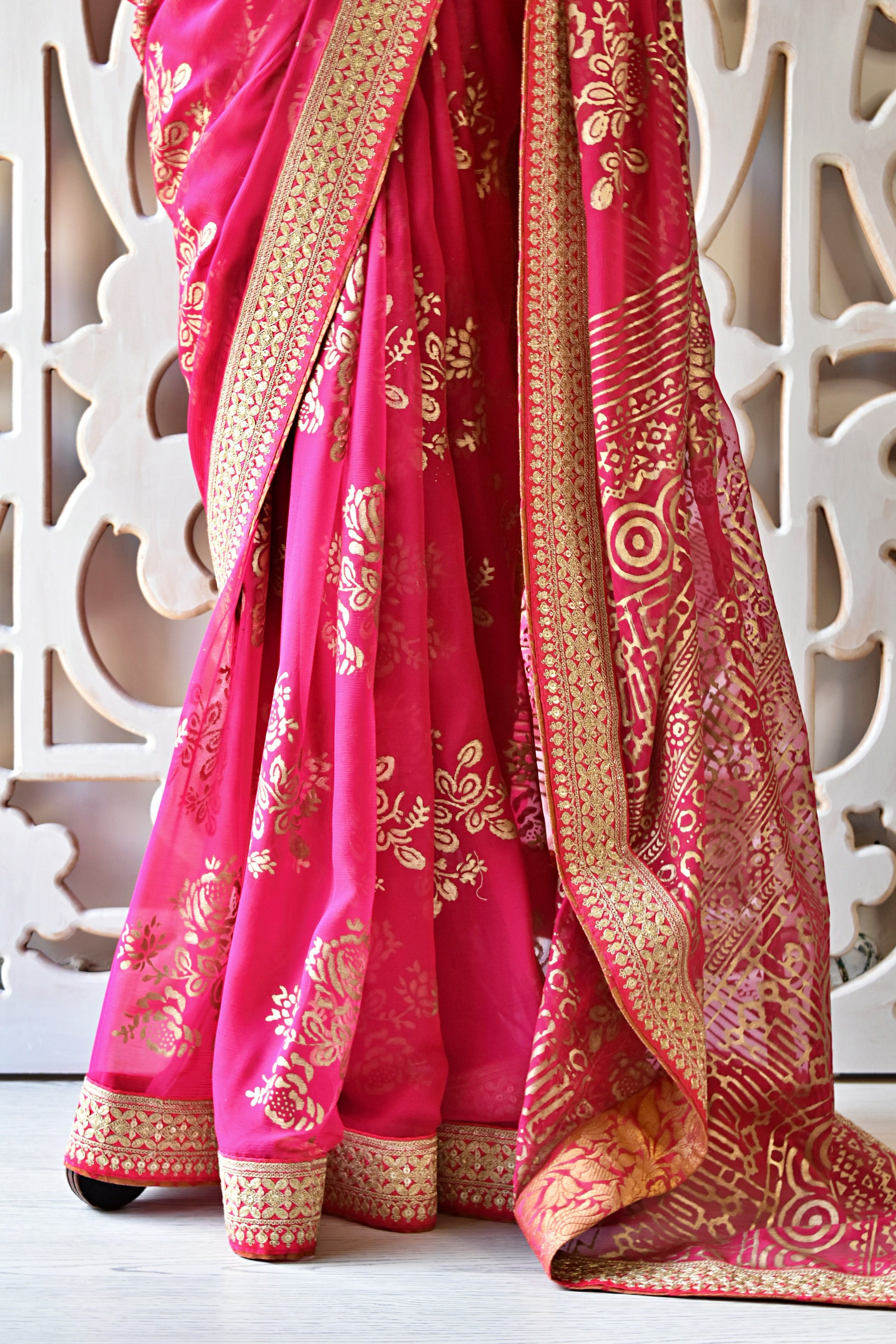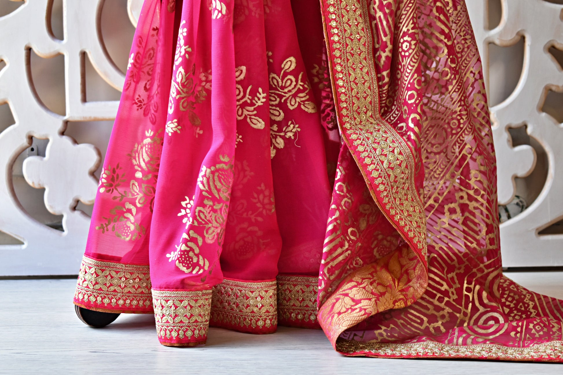 Hot pink pure chiffon block printed sari comes with pink and gold banarsi blouse and finishing. Sari has gold embroidered border.