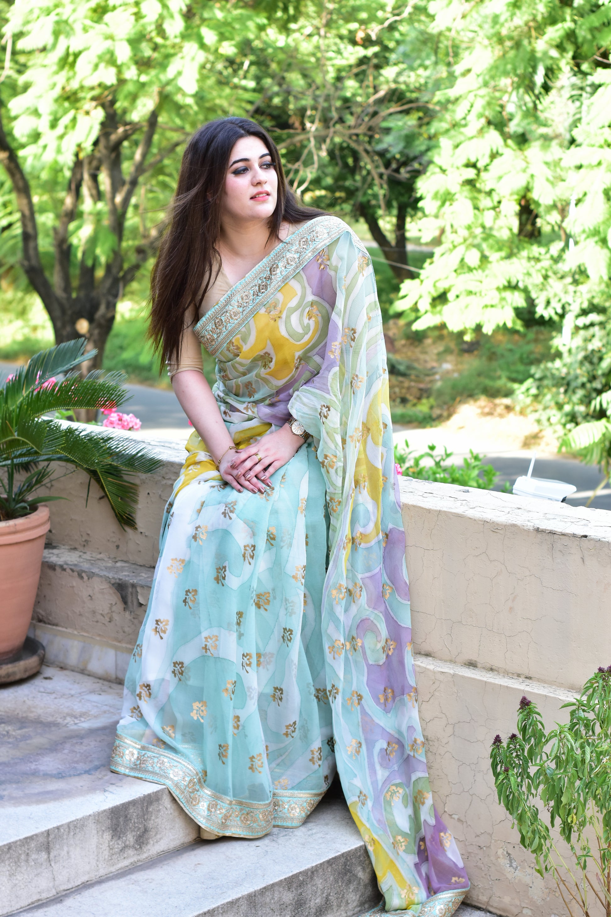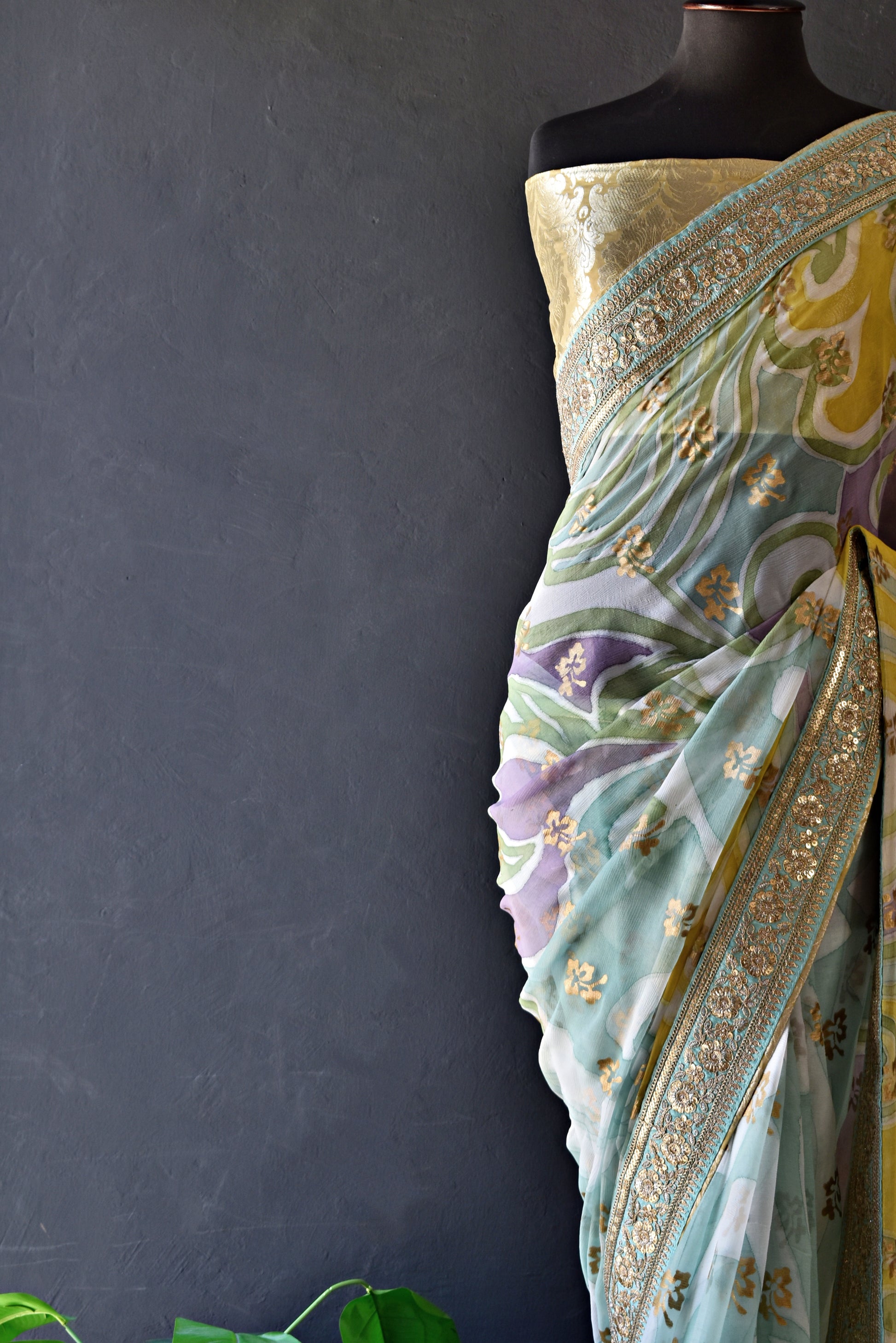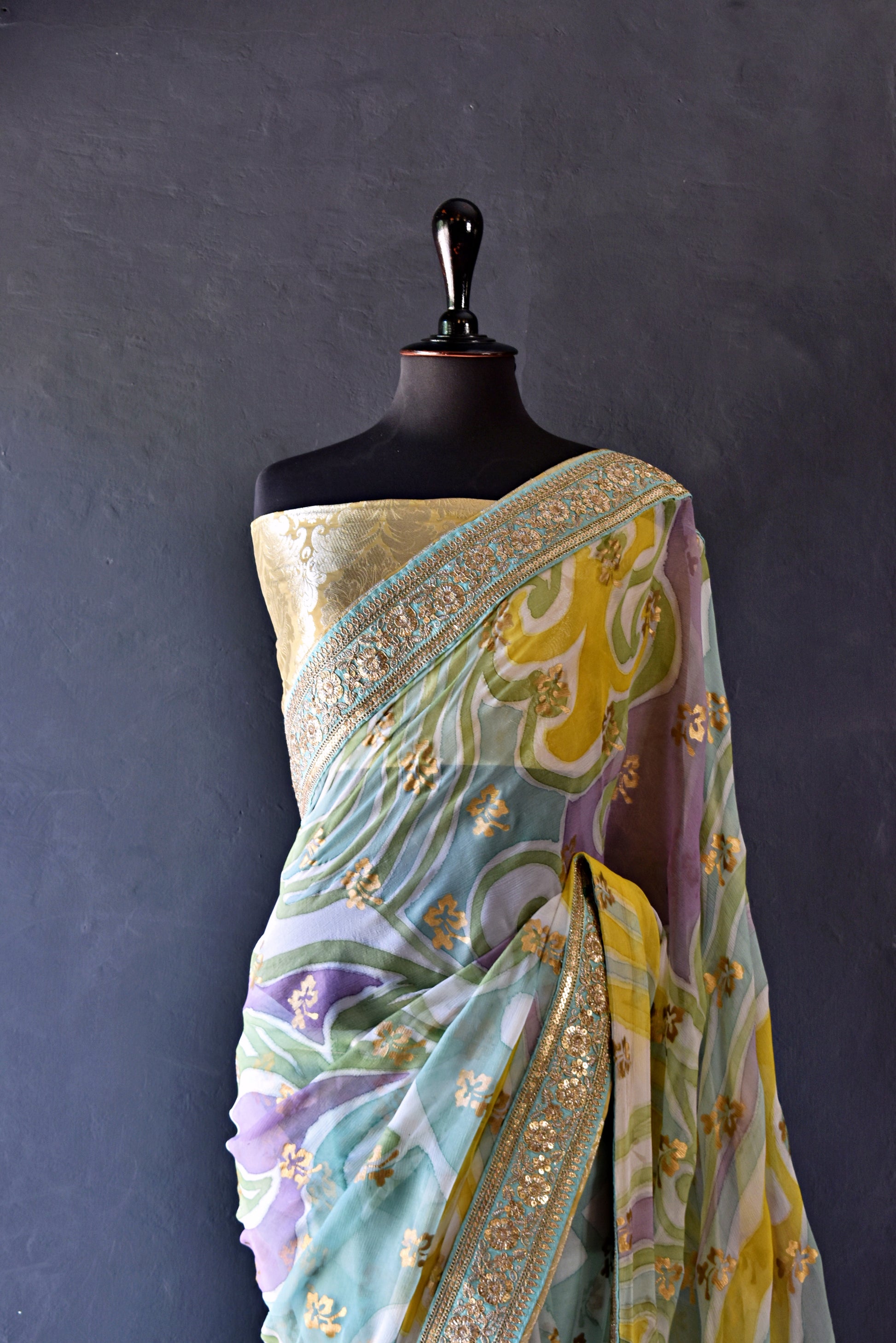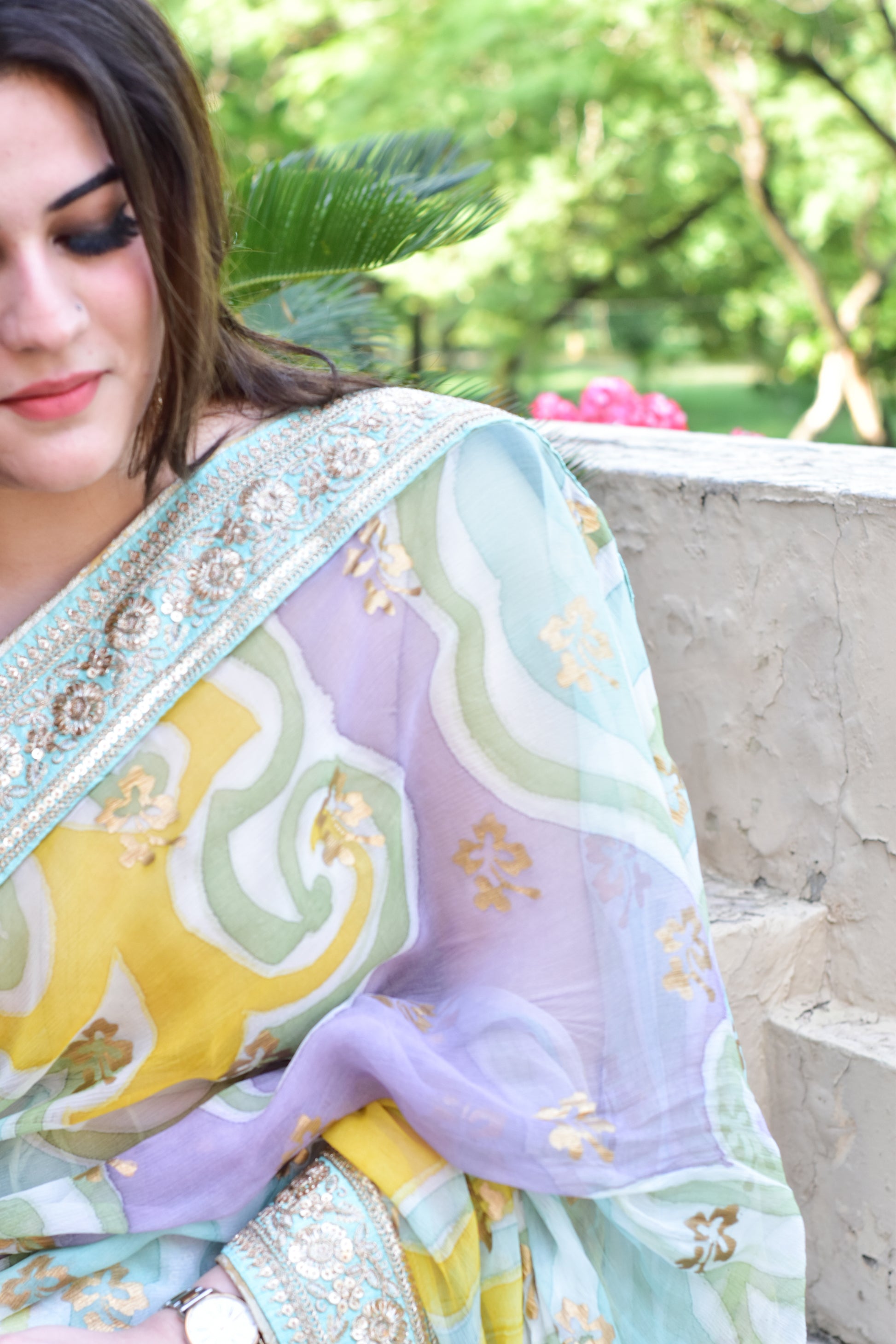 This ethereal masterpiece weaves together the celestial beauty of turquoise and the richness of purple, creating a dramatic and elegant ensemble. Turquoise and purple hand painted and block printed chiffon sari comes with dull gold banarsi blouse and finishing. Sari has turquoise and gold embroidered border.