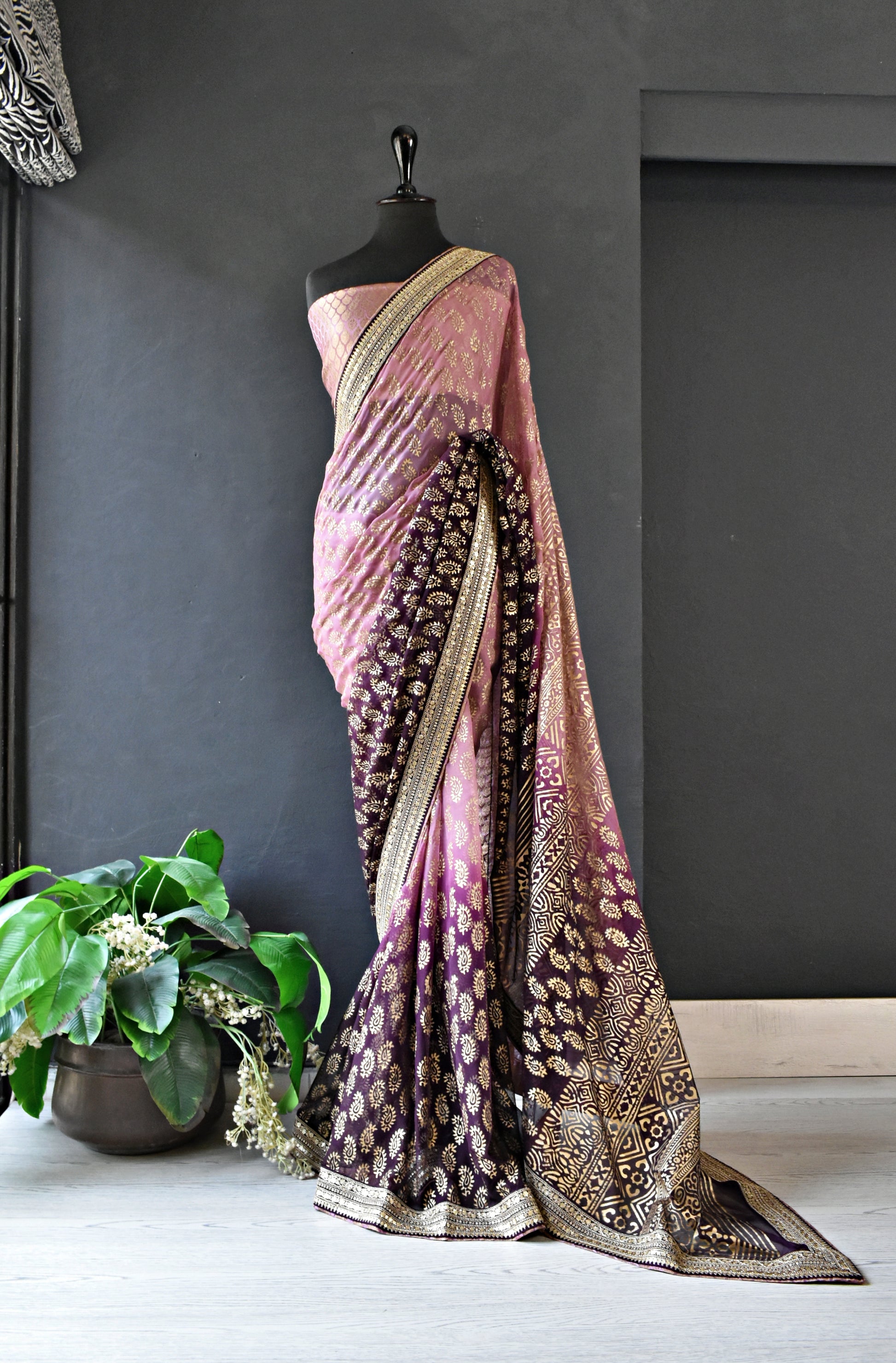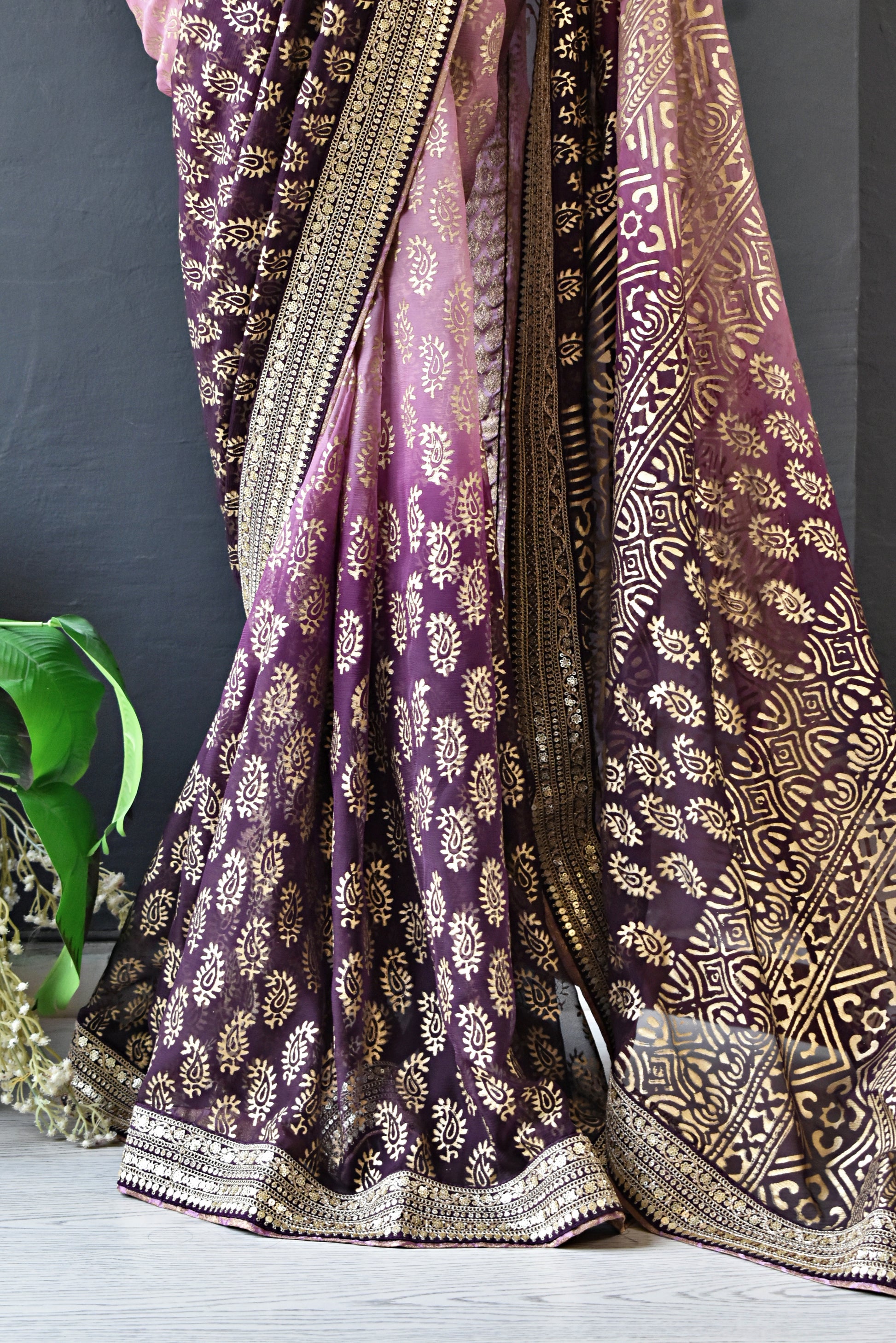 Pure chiffon Lilac sari with gold block print comes with lilac banarsi blouse and finishing. Sari has gold embroidered border.